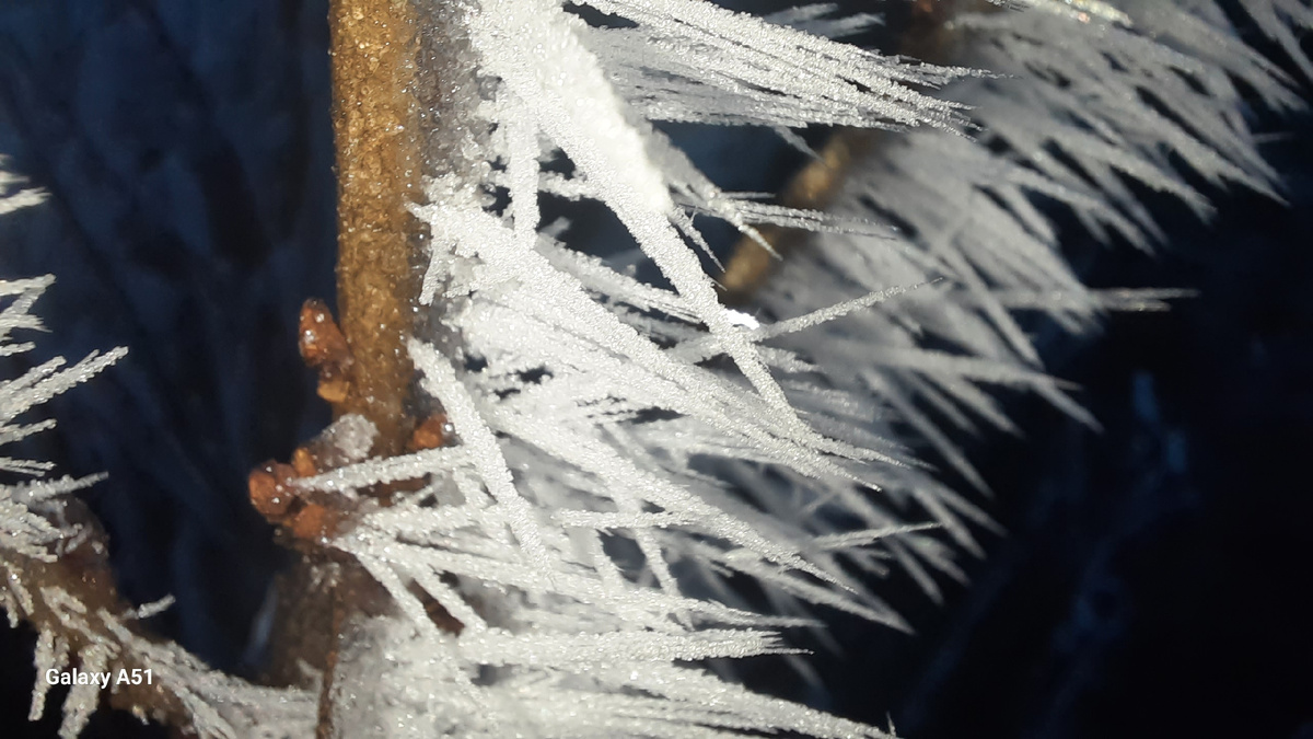 Приветствую подписчиков и просто заглянувших читателей. Сегодня пишу не на техническую тему, а больше на природно культурную. Поехал вчера со своим сынишкой, проведать его бабушку и деда, по совместительству моих родителей. И на подъезде к родному селу Клиновка/Кесек-Аратук/Бомбей (Официальное имя/старое/и жаргонное) стал замечать белизну на деревьях, что в общем то не редко у нас бывает - сочетание мелкого дождика с морозом часто приводит к обледенению, и образованию наледи. Опасное явление, особенно для электросетей. Но вот не задача - дождика та не было... Стоял не очень густой, но устойчивый туман с ветерком. И когда вышел из машины дабы открыть ворота во двор, стало ясно что это не лёд, точнее не наледь просто какой то скульптор создал свой морозный шедевр, полюбуйтесь листая картинки: Зато в режиме макросъёмки, стала понятна физика этого чуда форм и красоты. Из-за наличия ветерка, частицы тумана как бы конденсировались на поверхности ранее кристаллизированной воды, вытягиваясь