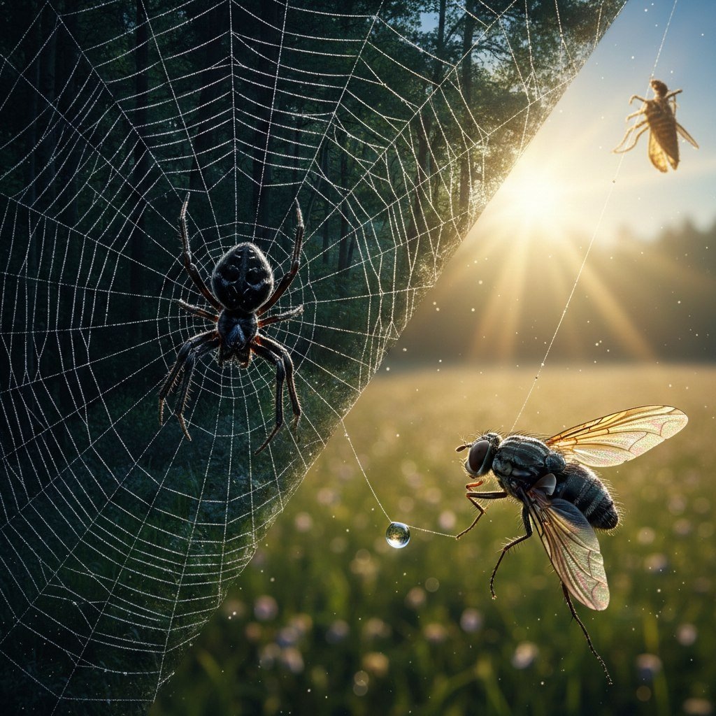 И вот однажды, пролетая над тёмной чащей, Муха увидела сияние. Это была Паутина, сотканная из утра и росы, переливающаяся всеми обещаниями рая. А в самом её центре, скромный и тихий, сидел Паук. Его глаза были глубокими, как лесные озёра, и в них Мухе почудилась бездонная, печальная мудрость.