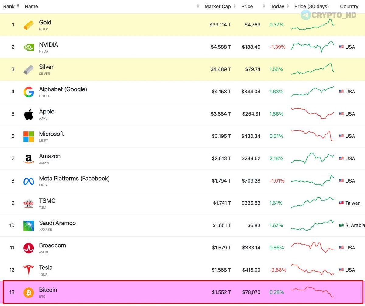 🫡 Биткоин вылетел из ТОП-10 мировых активов по рыночной капитализации…
