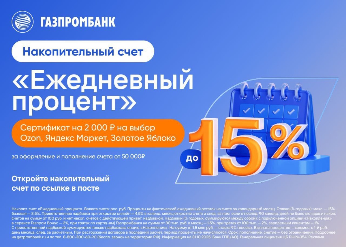 ! Как копить без усилий? Накопительный счет “Ежедневный процент” от Газпромбанка приносит до 15% годовых. Эти деньги всегда под рукой, но пока вы их не тратите, они растут! ✔️ неограниченная сумма снятий и пополнений по счету; ✔️ Начисление процентов на ежедневный фактический остаток ✔️ надбавка +2,5% за подписку Газпромбанк привилегии “Плюс”; 🔥 А если вы откроете накопительный счет сейчас и пополните его на 50 000 ₽ в течение 30 дней, то получите сертификат номиналом 2000 ₽ для покупок на одном из маркетплейсов на выбор: Ozon, Яндекс Маркет, Золотое Яблоко. Откройте накопительный счет по ссылке Для новых или действующих клиентов банка, у которых ранее не было открытых вкладов или накопительных счетов, а также заявок на них в течение 180 дней. Банк ГПБ (АО). Лицензия Банка России №354. Реклама. ИНН 7744001497