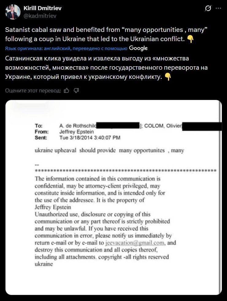 Дмитриев, спецпредставитель президента РФ, прокомментировал переписку американского финансиста Джеффри Эпштейна с неким Ротшильдом. В своём электронном письме Эпштейн, осуждённый за секс-торговлю и преступления против несовершеннолетних, упоминал Евромайдан и выражал надежду, что этот период откроет перед ним новые возможности. По словам Дмитриева, именно государственный переворот в Киеве стал причиной украинского конфликта. ❗️Ротшильды - династия банкиров и общественных деятелей еврейского происхождения. В 1816 году император Австрийской империи Франц II даровал им баронский титул. С XIX века Ротшильды считаются обладателями самого крупного состояния в мире, уступая лишь создателям Федерального резерва. * — движение сатанизма признано экстремистским и запрещено в Российской Федерации Lesen Sie weiter unten auf Deutsch...