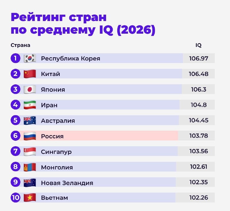 Россия заняла шестое место в международном рейтинге IQ среди 137 стран
