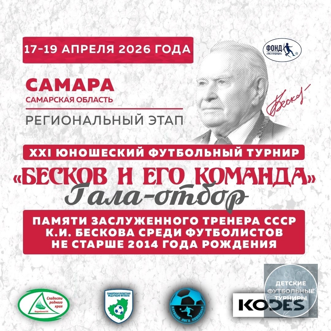 ! Приглашаем вас принять участие в отборочном турнире «Кубок Бескова» среди команд 2014гр, который пройдет в рамках Всероссийского проекта «Кубок Поволжья» с 17 по 19 апреля в формате 9×9. 🌸 Весна — идеальное время для большого футбола! Самара распахнет свои футбольные поля и с теплом примет команды со всей России. Нас ждут яркие матчи, настоящий соревновательный дух, эмоции и бескомпромиссная борьба за главный трофей сезона. 🏆 Главная интрига турнира — победитель получит путёвку на Гала-отбор в Москву, с 9 по 15 ноября 2026 года, где соберутся сильнейшие команды страны. Ждём вас на поле, где рождаются характер, победы и футбольные истории! ⚽🔥 Группа организаторов vk.ru/respect_dfl Подробная информация 8(937) 181-18-11 Евгений Александрович 8(937) 654-44-45 Юлия -— #ФутбольныйТурнирАпрель2026 #ФутбольныйТурнирЦентральнаяРоссия2026 #ФутбольныйТурнирСамара2026 #ФутбольныйТурнирСамара2014гр Источник: https://vk.com/wall-179468598_2371