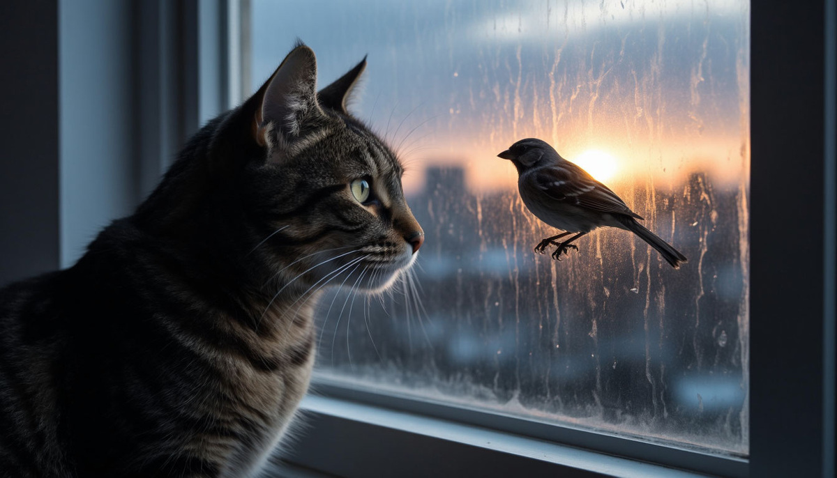 Он прижимается к стеклу так близко, что нос оставляет отпечаток на холодной поверхности. Хвост — жёсткий, как проволока, кончик подрагивает в такт движению птицы. Губы подрагивают, из горла вырывается странный звук: не мяуканье, не рычание — нечто среднее между щёлчком и чириканьем. Вы думаете: «Какой милый». Но это не игра. Это фрустрация хищника, запертого между двумя мирами: миром инстинкта и миром стекла. Его тело уже прыгнуло. Его разум уже поймал добычу. Только тело не может пройти сквозь прозрачную стену. И в этом разрыве рождается тихая трагедия охотника, лишённого охоты.