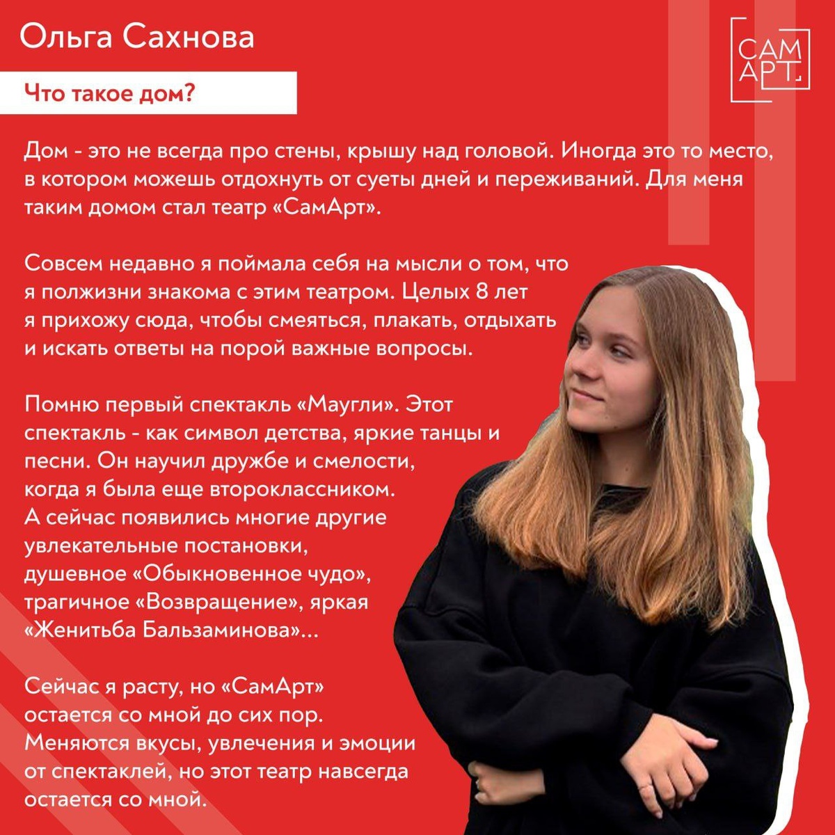 ♥️ Мы предложили участникам Арт-кампуса поделиться своей любовью к театру с другими зрителями и рассказать о том, как они влюбились в СамАрт. Арт-кампус — комьюнити амбассадоров, увлекающихся театральной журналистикой, фото- и видеосъемкой, а также зрительскими проектами. Сегодня делимся историями Ольги Сахновой и Петра Фокина. А как произошло ваше знакомство с СамАртом? Ждём ваших историй в комментариях! 🫂