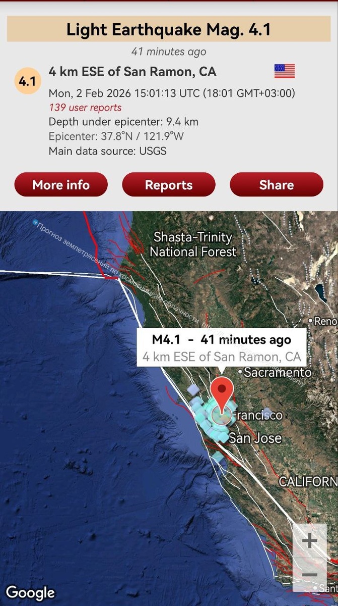 Произошло ощутимое землетрясение М4 у Сан Франциско. Энергия сброшена не полностью, не исключаю более сильное продолжение. Крайние ОСТИ по зоне были на М6+, а ранее были январские ОСы на М7-8, уходящие в сторону плиты Хуана де Фука.