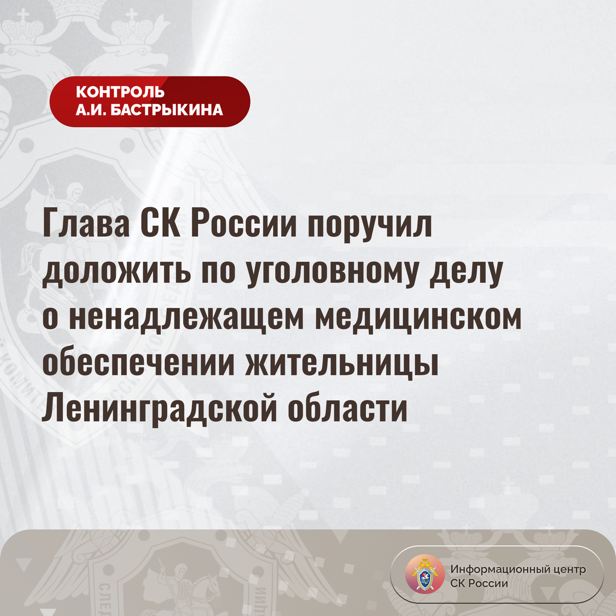 Глава СК России поручил доложить по уголовному делу о ненадлежащем медицинском обеспечении жительницы Ленинградской области