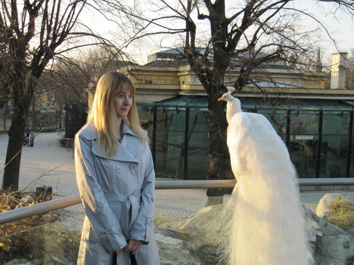 Почти в самом конце нашего стремительного путешествия по венскому зоопарку Шёнбрунн мы заметили большую белоснежную птицу с длинным роскошным хвостом. Я до этого никогда не видела белого павлина и ни сразу поняла, что это за птица. Она сидела на перилах смотровой площадки. Солнечный луч, вышедший из-за облаков, слегка коснулся пышного хвоста и изящной спинки птицы, от чего она казалась золотой. Словно Жар-птица. Очнувшись от наваждения, мы ринулись на смотровую площадку, поближе рассмотреть белоснежное чудо. Привыкший к восторженному вниманию павлин встретил нас с королевским достоинством и милостиво позволил подойти ближе. Похоже он чувствовал себя хозяином зоопарка. Все звери за ограждением, а он гуляет сам по себе. Выбрал самое высокое место в парке и созерцает .