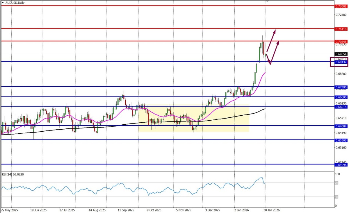 Итак, цена продолжила рост на прошлой неделе и сразу же достигла целевого уровня 0.7015 (максимум 2024 года). Рост остановился в области сопротивления 0.7055. В прошлую пятницу цена отправилась в коррекцию. Прошлая неделя была богата на важные события, касающиеся драгоценных металлов и политики ФРС США. Цены на золото, серебро и медь резко упали в пятницу после достижения рекордных максимумов, поскольку обеспокоенные инвесторы стремились зафиксировать прибыль из-за ослабления надежд на агрессивное снижение процентных ставок в США и стабилизации доллара. На этом фоне американский доллар (DXY) после обновления минимума 2025 года в области 95.95 смог не только компенсировать падение в начале недели, но и показать недельный рост на 0,24%. Также поддержку доллару оказали заявления Трампа в отношении нового главы ФРС. В пятницу, 30 января, Трамп заявил, что выбрал бывшего управляющего Федеральной резервной системы Кевина Уорша на пост главы Федеральной резервной системы США. Показатель курса