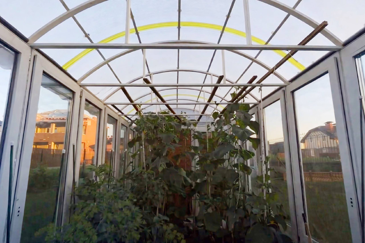 Уход за такой теплицей минимальный. Пластик и стекло спокойно переносят влагу, не покрываются плесенью и не интересуют насекомых. Геометрия сохраняется годами. Единственный элемент с ограниченным ресурсом связан с крышей. Поликарбонат со временем теряет прочность, но его замена не требует серьёзных затрат.