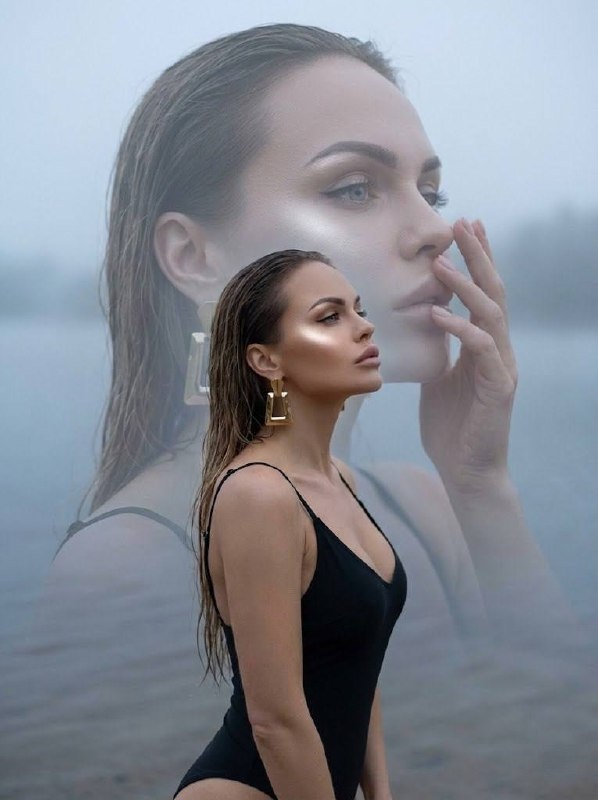 ! #фотосессия@promtgs Модель: Banana 😎 Промт: Фотореалистичное художественное фото. Используй прикрепленное личное фото женщины как референс внешности: лицо максимально похоже на референс, сохранить узнаваемость, форму глаз, носа и губ, линию челюсти, тон кожи, брови, без изменения возраста. Естественная кожа без эффекта пластика и без сильной ретуши. Сюжет и эффект: двойная экспозиция. На фоне крупный полупрозрачный портрет той же женщины, поверх него основной персонаж в резкости. Эффект должен выглядеть как реальная фотосъемка с двойной экспозицией, без цифровых артефактов, без надписей и без графики. Главный персонаж (передний план): Поза: женщина по пояс и чуть ниже, разворот корпуса в три четверти, голова повернута в сторону, взгляд направлен вверх и вдаль, выражение спокойное и уверенное. Одна рука обхватывает вторую, руки скрещены на уровне груди. Одежда: черный цельный купальник, матовая ткань, тонкие бретели, без узоров и логотипов. Волосы: мокрые длинные волосы, зачесаны н