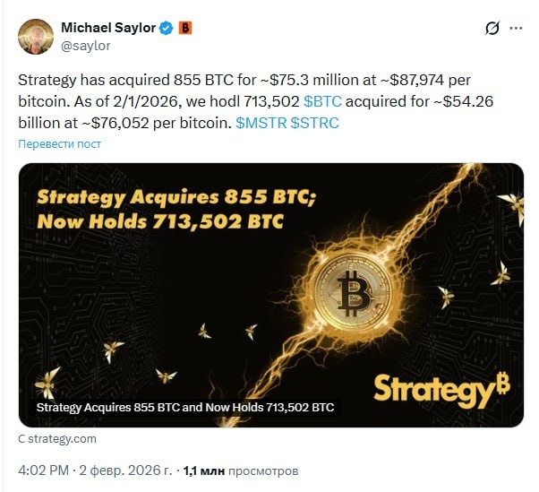 🔸 Strategy приобрела 855 BTC за $75,3 млн по цене около $87974 за биткоин. По состоянию на 1.02.2026 компания владеет 713 502 BTC.