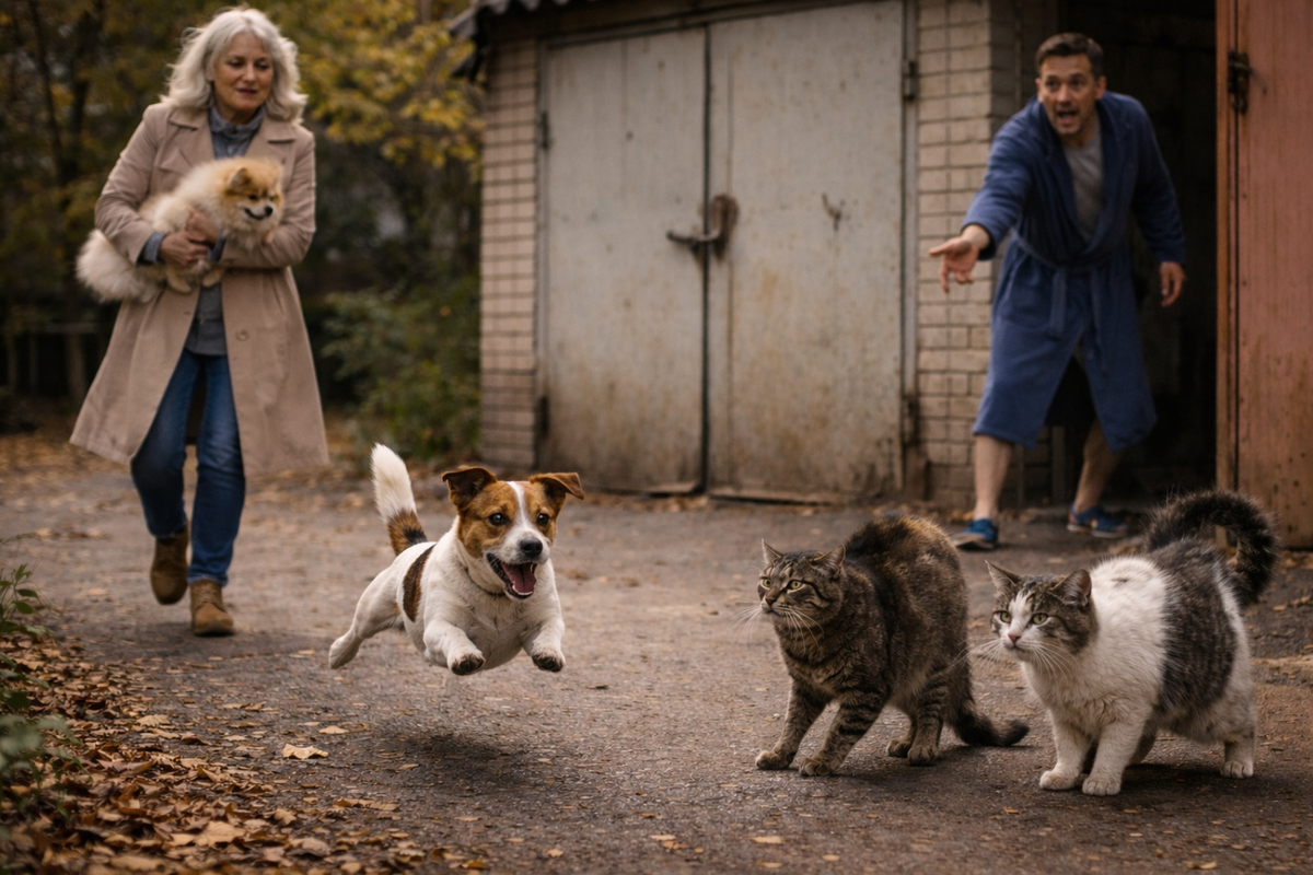 В предрассветном воздухе есть нечто неизбежное и рассудительное. Словно сама материя, ещё сонная и серая, задаётся вечными вопросами. Двор в этот час — это модель мира в миниатюре. И законы его порой открываются в самых неожиданных формах. Надежда Сергеевна, женщина, хранящая отпечаток на лице множества тихих утр, несла под мышкой шпица Арчибальда. Это мало походило на прогулку, а скорее на транспортировку законсервированного аристократизма из точки «квартира» в точку «лужайка». Арчибальд воспринимал мир через призму лёгкой брезгливости. Их путь прервало странное действо. Из-за угла гаража, этого дворового святилища теней и тайн, показались два кота. Их шествие было торжественно и неспешно. Шерсть их, взъерошенная, сияла в косых лучах солнца, точно нимбы у раннехристианских святых. Перед ними, буквально разрывая ткань утренней гармонии, металось третье существо. Маленькое, пёстрое, с азартом маньяка, одержимого одной идеей. Идея эта, очевидно, заключалась в полном и немедленном низве