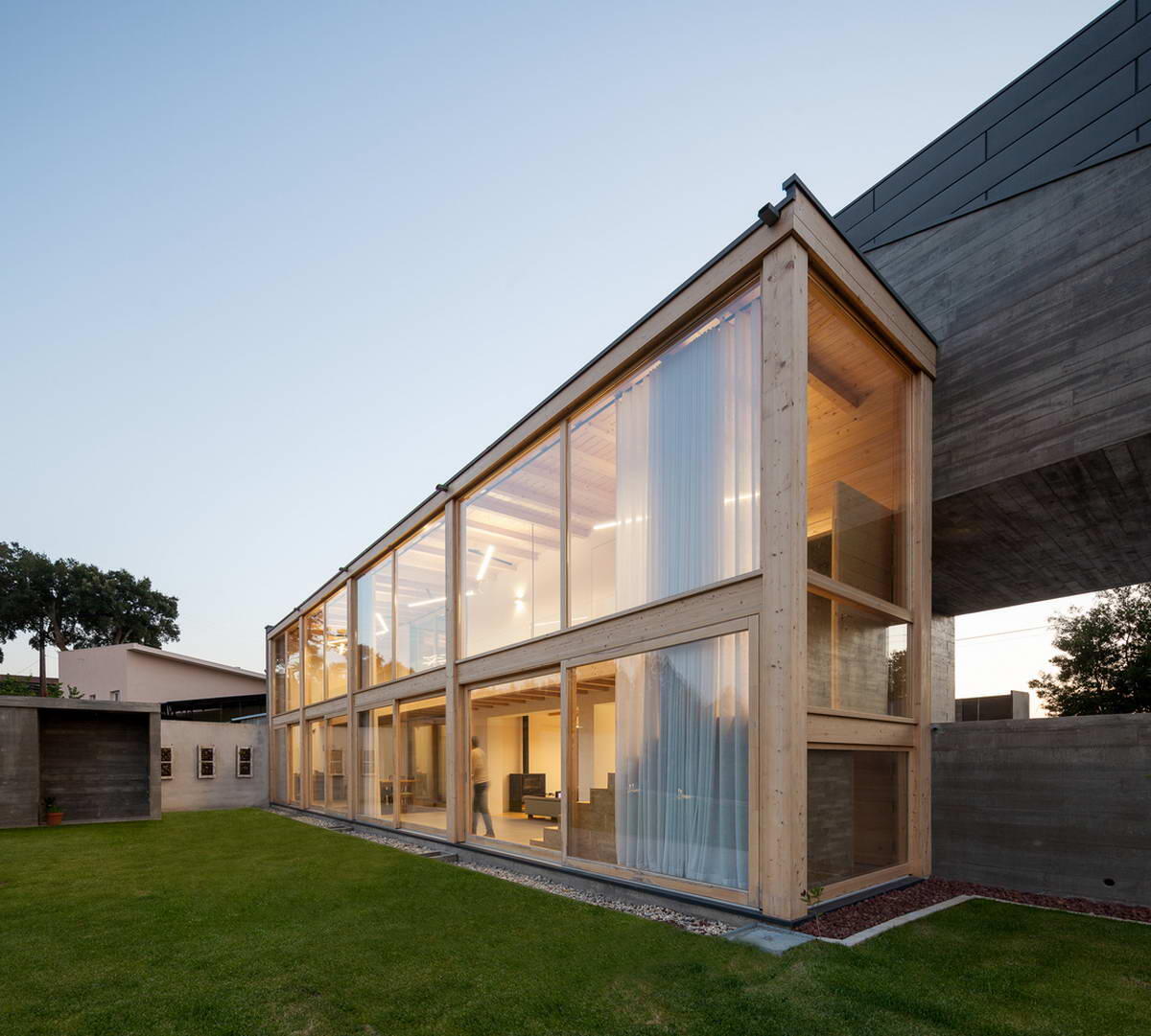 Старый каменный дом на окраине, но недалеко от исторического центра, и новый бетонный объединены эффектной конструкцией из дерева и стекла. Расположенный в сельской местности, но недалеко от исторического и центрального центра Санта-Мария-да-Фейра, проект развивается на основе восстановления существующего каменного дома и строительства нового бетонного корпуса, соединенного посредством деревянной конструкции и широких проёмов в откровенном диалоге с внешним миром и окружающей средой. Существующая конструкция ограничивается непосредственно дорогой, а местность ограничена водной линией, которая придаёт большую широту и красоту месту. Вдоль дороги бетонная стена прерывает существующую каменную стену, чтобы дать начало новому входу и, следовательно, новому телу. Вход в дом является центральной и промежуточной точкой распределения, которая связывает два этажа. Верхний этаж, отведённый под частную зону, с бетонным объёмом, предназначенным для комнат и санузлов детей, и каменным объёмом, пре