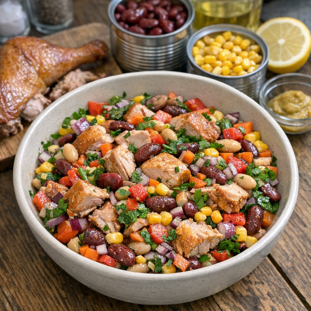 Это не салат на один час к столу, а нормальное блюдо, которое спокойно живёт в холодильнике пару дней, не течёт и не превращается в кашу. По факту это готовое второе в холодном виде: фасоль даёт плотность и белок, копчёная курица вкус и аромат, овощи добавляют свежесть и цвет. Такой салат удобно есть дома, брать в контейнер на работу и предлагать в формате готовых порций для небольших магазинов или кулинарий.