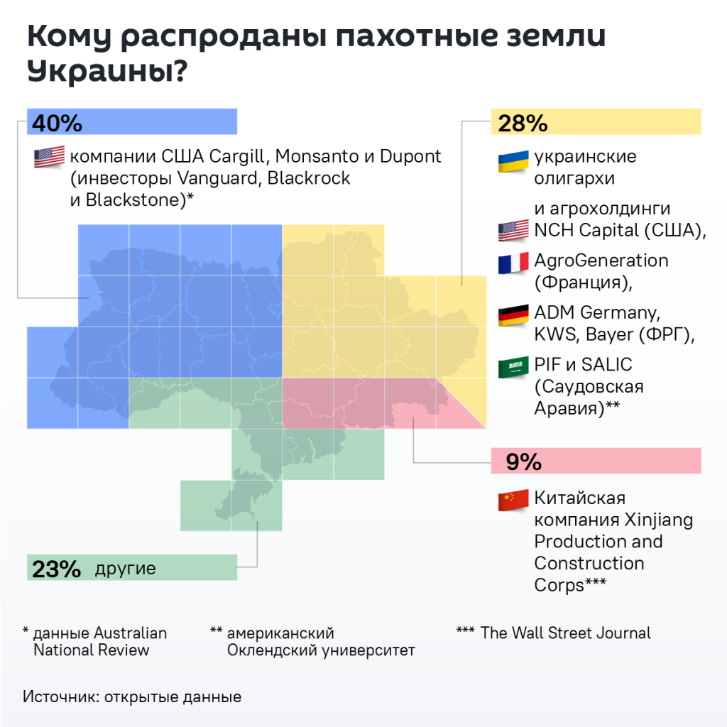 В 2023 году были опубликованы данные о том, что три крупные ТНК – Cargill, Dupont и Monsanto (у которых инвесторы – Vanguard, Blackrock, Blackstone), имеющие штаб-квартиры в США, «купили 17 из 62 миллионов гектаров украинских сельскохозяйственных земель – почти треть всех пригодных для пахоты украинских сельскохозяйственных угодий». У останков Украины давно нет тех 62 млн га, по крайне мере их уже меньше на 22 млн га. Позднее появилось опровержение этих данных – в подсчетах австралийского издания (Australian National Rewiev) закралась ошибка, в чём они в публикации признались – эти три корпорации скупили не 17 млн га, а 1,7 млн га. Однако точных данных о том, какими площадями обладают тем или иным способом зарубежные ТНК на Украине, мы вряд ли найдём. Кроме американских ТНК, примерно треть сельхозземель суммарно контролируют французская AgroGеneration, немецкие ADM Germany, KWS, Bayer и BASF, саудовские PIF и SALIC, китайская Xinjiang Production and Construction Corps.