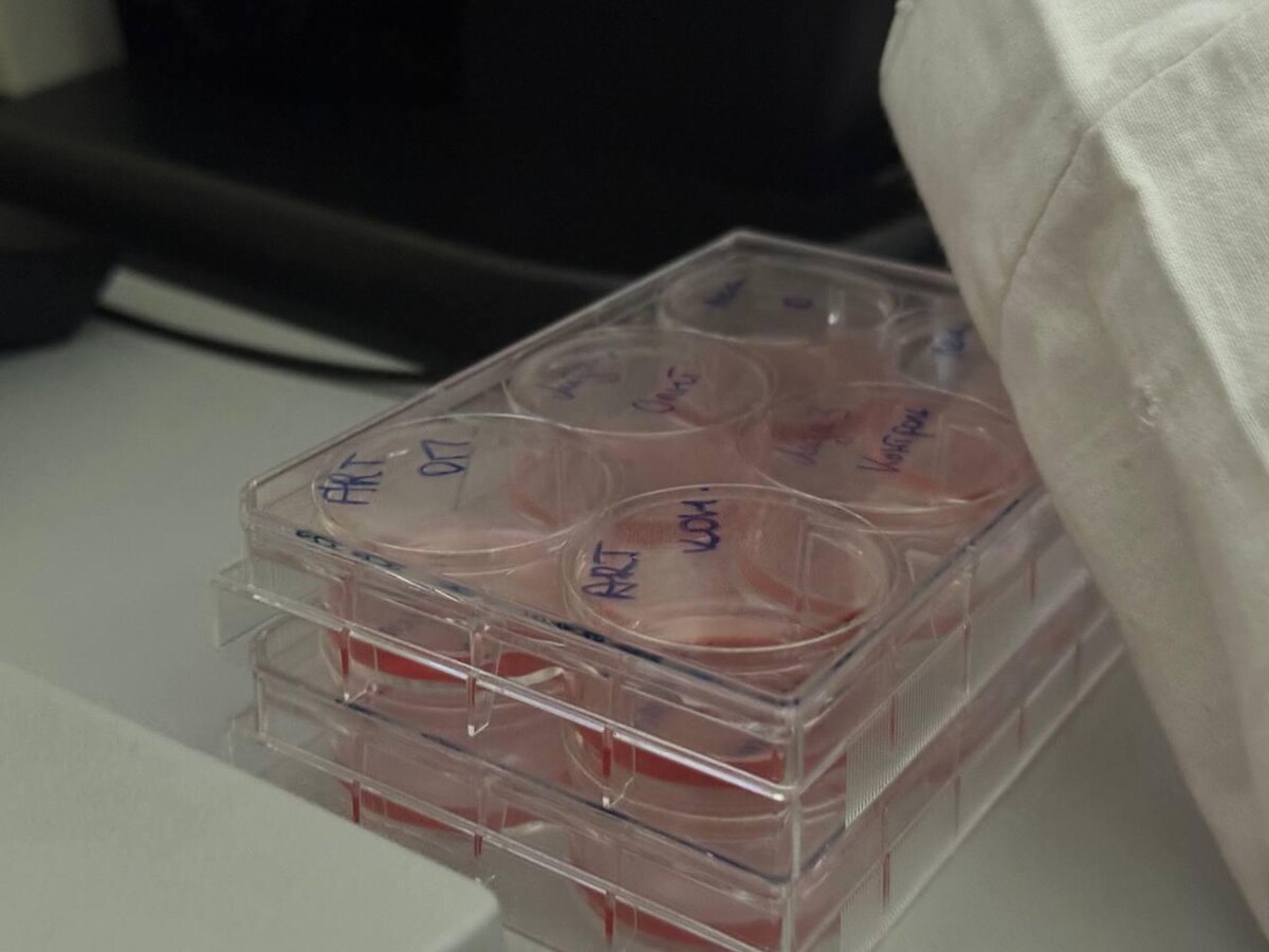 Сколько людей на этой фотографии? От одного видно руку, а от второго почку. В этой розовой воде сидят микроскопические клетки почки. Наш редактор работал с ними в одной из лабораторий МГУ. Сами клетки прозрачные и сидят на стенках, а розовое — это специальный индикатор. Он говорит, что почку покормили. Когда станет желтым, значит, почка все съела, и пора бы ее пересадить. Напоминает тамагочи. Стоп. Откуда вообще взялась эта почка? Зачем мы выращиваем ее? Донором была девушка, но ее личность никто не знает, ведь этой почке уже больше 50 лет. Важно другое: когда врачи взяли образец ткани, они немного отредактировали гены всех клеток, чтобы они перестали стареть и стали бессмертными. Получились клетки HEK 293, то есть сделанные с 293 попытки. Что им дало бессмертие? Они не собираются в новые органы, а бесконечно делятся и расползаются в разные стороны. Клонов уже настолько много, что их растащили по лабораториям всего мира. Но если собрать их в одну кучу и взвесить, получится организм вес