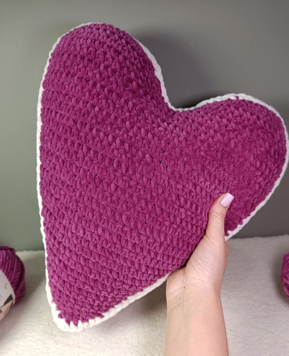Подушка состоит из двух половинок, которые мы соединим столбиками без накида (СБН). Для вязания вам потребуется: 1. пряжа Himalaya Dolphin baby "Ягодный" (338), 120 м/100 г, 2 мотка, 2. Пряжа Himalaya Dolphin baby немного белого цвета. 3. Крючок 4,5 мм 4. Наполнитель, у меня синтепух. 1. В кольцо амигуруми вяжем 2 СБН (2) 2. 2 прибавки (пр) (4) 3. Пр + 2 СБН + пр (6) 4. Пр + 4 СБН + пр (8) 5. Пр + 6 СБН + пр (10) 6. Пр + 8 СБН + пр (12) 7. Пр + 10 СБН + пр (14) 8. Пр + 12 СБН + пр (16) 9. Пр + 14 СБН + пр (18) 10. Пр + 16 СБН + пр (20) 11. Пр + 18 СБН + пр (22) 12. Пр + 20 СБН + пр (24) 13.Пр + 22 СБН + пр (26) 14. Пр + 24 СБН + пр (28) 15. Пр + 26 СБН + пр (30) 16. Пр + 28 СБН + пр (32) Вязание с Мариной Лосевой