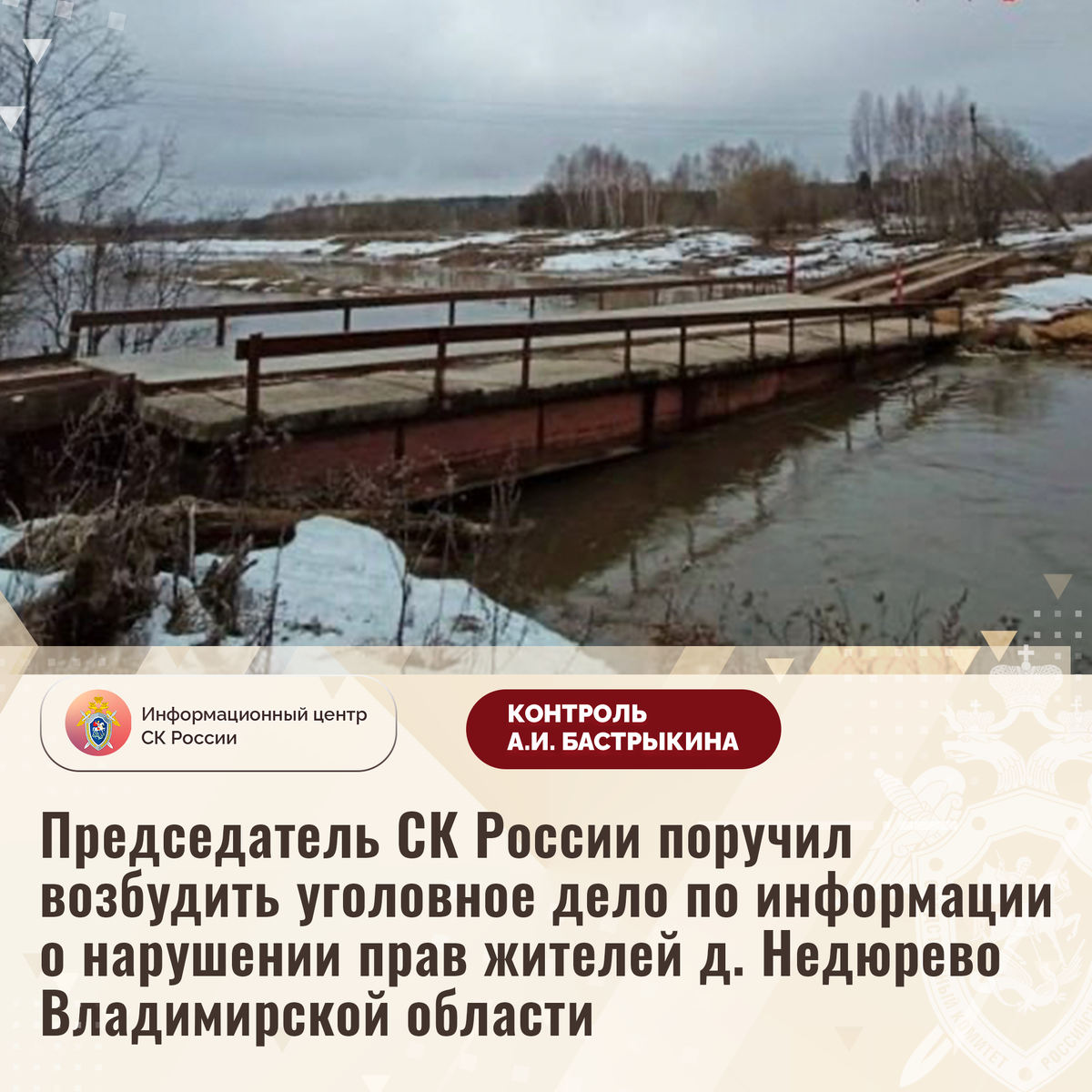 Председатель СК России поручил возбудить уголовное дело по информации о нарушении прав жителей д. Недюрево Владимирской области В социальной сети сообщается о нарушении прав жителей деревни Недюрево Владимирской области на транспортную доступность. Единственный мост, ведущий в населенный пункт, находится в аварийном состоянии: покрытие разрушается, несущие опоры просели. В результате проезд автомобилей экстренных служб невозможен. Обращения в уполномоченные органы результатов не принесли, мер к возведению новой переправы через реку Большой Киржач не принимается. В СУ СК России по Владимирской области организована процессуальная проверка. Председатель Следственного комитета Российской Федерации Александр Иванович Бастрыкин поручил и.о. руководителя СУ СК России по Владимирской области Сергею Алексеевичу Аферову возбудить уголовное дело и представить доклад о предварительных и окончательных результатах расследования уголовного дела. Исполнение поручения поставлено на контроль в централь