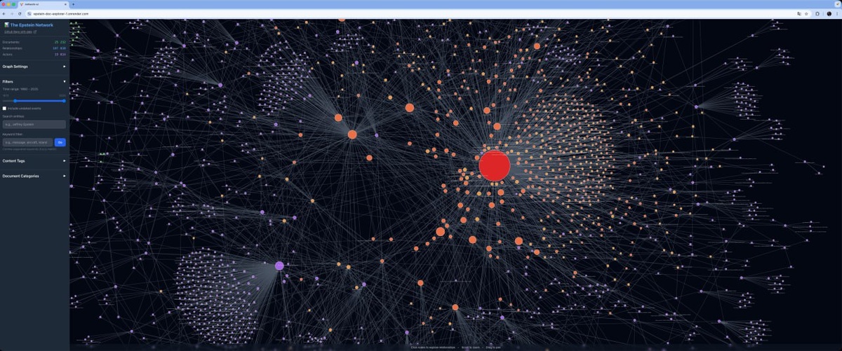 Это хороший пример того, как утечка данных повлияла на жизнь всего мира. И кто-то даже выложил 25232 файлов и составил граф взаимодействий всех 19034 участников из его переписок. Зайти посмотреть на это, пока не прикрыли, можно тут: epstein-doc-explorer-1.onrender.com (предупреждаю - надо очень долго ждать загрузки) Сделано на основе: github.com/maxandrews/Epstein-doc-explorer #утечки @acba