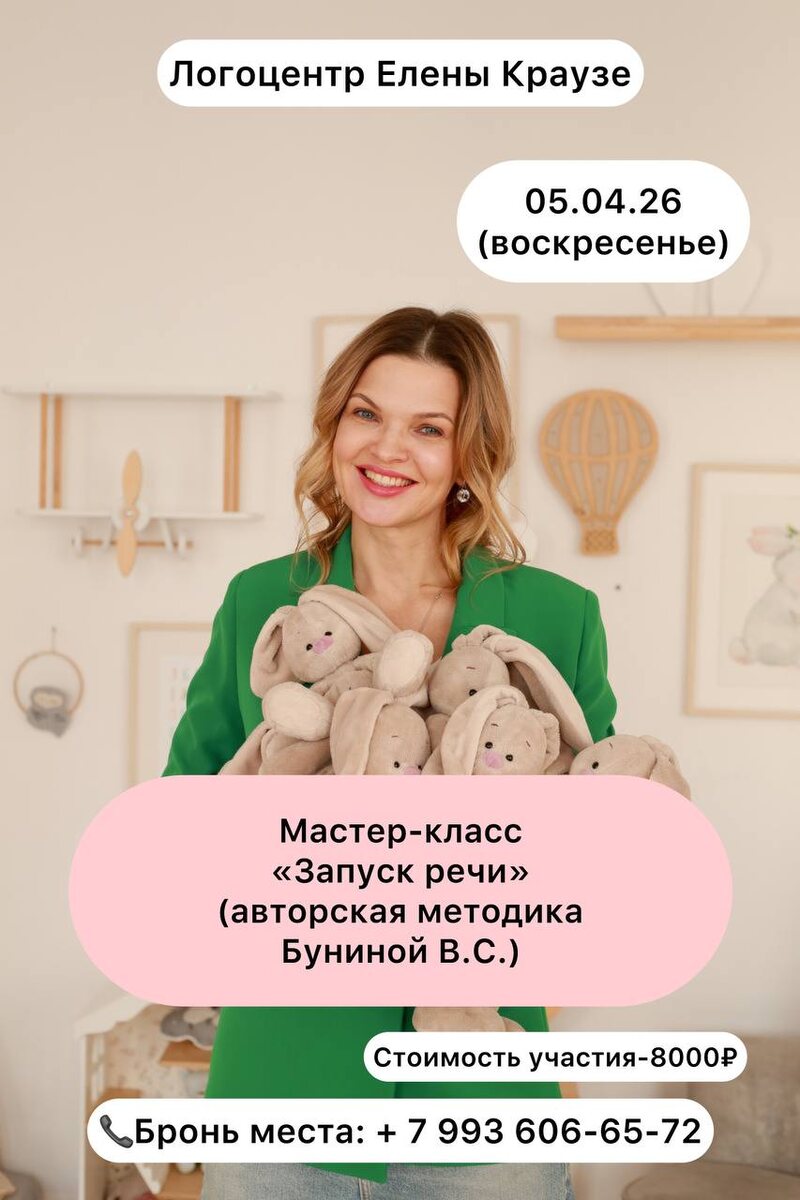 https://t.me/logoped_viktoria! Очень ждём спикера с мастер-классом «Запуск речи. Выход неговорящего ребёнка из безречья к развернутой фразовой речи» Авторская методика Буниной В.С. по выстраиванию программы работы с учетом структуры имеющегося у ребёнка дефекта. 🤔Что вас ждет? ✅6 часов интенсивной работы по одной из самых актуальных тем для логопедов ✅небольшой формат мероприятия - камерная уютная атмосфера (мастер-класс будет проходить на территории «Логоцентра Елены Краузе» (метро «Лесопарковая») ✅кофе-пауза и небольшой фуршет, во время которого можно обсудить с коллегами профессиональные проблемы 🗓️05.04.26 (воскресенье) ⏰11.00 👩🏼🎓Сертификат участника от моего логоцентра 💳Стоимость - 8000₽ 📞Подробная программа мастер-класса, бронь места - по телефону или в ТЕ: +7 993 606-65-72