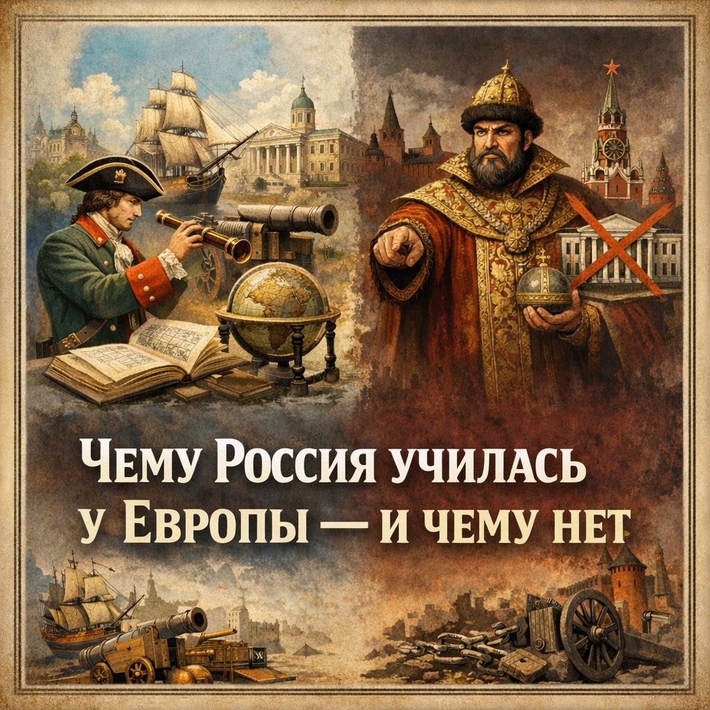 Отношения России и Европы на протяжении веков строились сложно и противоречиво. Россия постоянно заимствовала европейский опыт — в армии, науке, культуре, управлении. Но при этом многое из того, что в Европе стало нормой, в России так и не прижилось. Почему одни заимствования работали, а другие — нет? 1. Военному делу и технике