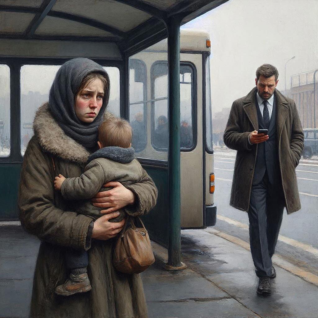 Его мозг, занятый расчётами убытков от срыва сделки, зафиксировал детали против воли. Девушка. Совсем молодая. Промокшая насквозь, тонкая кофточка прилипла к плечам. Она не пряталась от дождя, будто не замечала его. В руках она прижимала к себе большой свёрток, из-под края которого виднелся крошечный кусочек вязаной детской шапочки. И синяк. Старый, жёлто-зелёный, под левым глазом. Он цвёл на её бледном лице, как чудовищный цветок.