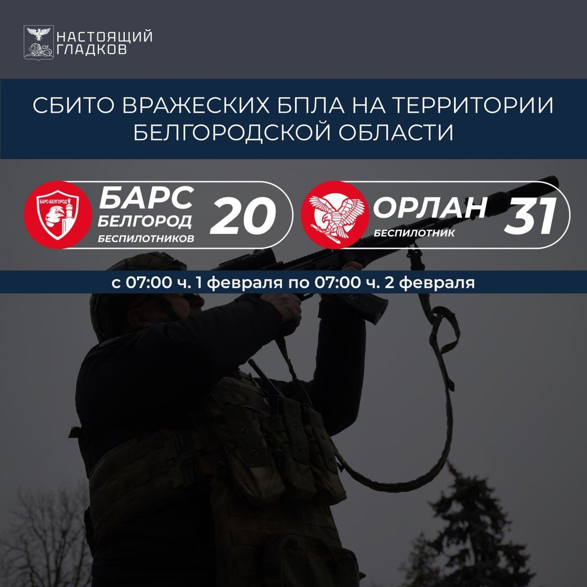 »**](https://t.me/vvgladkov/18920)** С 07:00 ч. 1 февраля по 07:00 ч. 2 февраля ликвидирован 51 беспилотник **[**«БАРС-Белгород» — 20 беспилотников:**](https://t.me/vvgladkov/18920) 📍подавлены РЭБ: — Белгородский округ: 1 FPV-дрон; — Краснояружский округ: 4 FPV-дрона. 📍 сбиты из стрелкового оружия: — Белгородский округ: 4 FPV-дрона; — Шебекинский округ: 5 FPV-дронов. 📍 средствами противодействия БПЛА сбиты: — Белгородский округ: 1 дрон-камикадзе "Жук"; 1 дрон-камикадзе "RAM-2x"; 1 дрон-камикадзе "Бебрадрон"; 1 разведывательный БПЛА "Лелека"; — Краснояружский округ: 1 разведывательный БПЛА "Щедрик"; 1 разведывательный БПЛА "A1-CM FURIA". [**«Орлан» — 31 беспилотник: **](https://t.me/vvgladkov/18920)** ** 📍подавлены РЭБ: — Белгородский округ: 14 FPV-дронов; — Валуйский округ: 1 FPV-дрон; — Краснояружский округ: 2 FPV-дрона. 📍 сбиты из стрелкового оружия: — Валуйский округ: