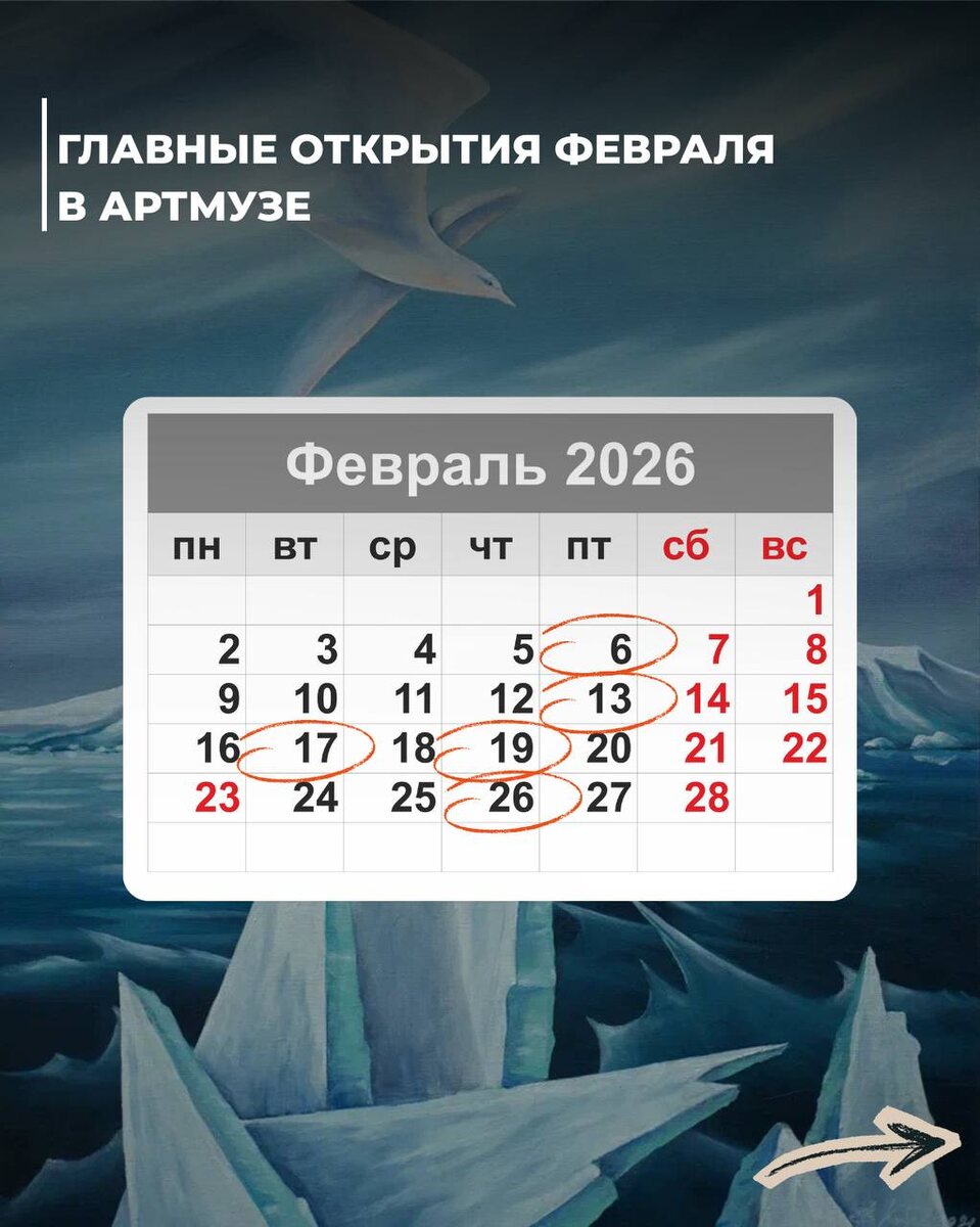 ! Зима выходит на финишную прямую, а в галереях Артмузы становится всё жарче от новых открытий. Собрали для вас календарь вернисажей и выставок, которые нельзя пропустить в этом месяце. Листайте карточки, сохраняйте даты и планируйте свой культурный досуг! 👇 Что нас ждет: «Как ходит конь» | Виктор Кобзев — сюрреалистичная игра в шахматы, где каждый ход ломает логику и правила 🗓 Вернисаж: 6 февраля в 19:00. «То, что греет» | Анастасия Ярыгина — выставка-уют о запахе хлеба, мурлыканье кота и солнечных зайчиках. 🗓 Вернисаж: 13 февраля в 19:30. «Вскачь» | Творческий союз АСРКИиИ — исследование образа лошади как символа жизни и движения. 🗓 Вернисаж: 17 февраля в 19:00. «Синестезия сцены» | Анастасия Башинская — магия концертной фотографии и неуловимая душа сцены. 🗓 Вернисаж: 19 февраля в 19:00. «Жизнь, увиденная кистью» | Владимир Слепухин — ретроспектива к 90-летию выдающегося мастера Петербурга. 🗓 Работает с 21 февраля. «Свет и бархат. Пастель» — групповая выставка, воспева