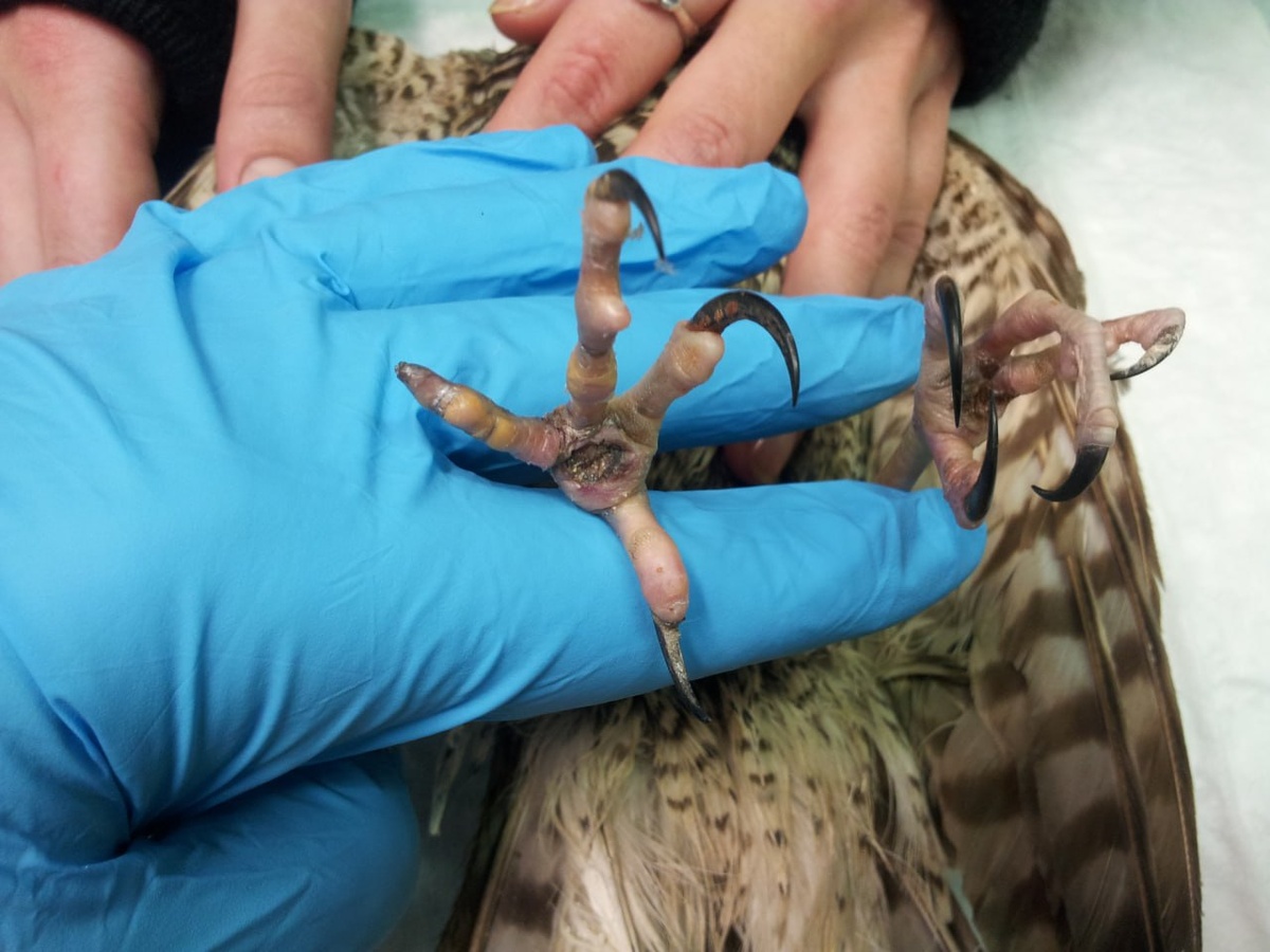 Гнойно - некротический пододерматит у филина. Местные обработки и иммуностимуляторы и полноценный рацион - основные составляющие лечения. На первом приеме самостоятельно не передвигается, опирается на хвост, крылья. Прогноз осторожный.