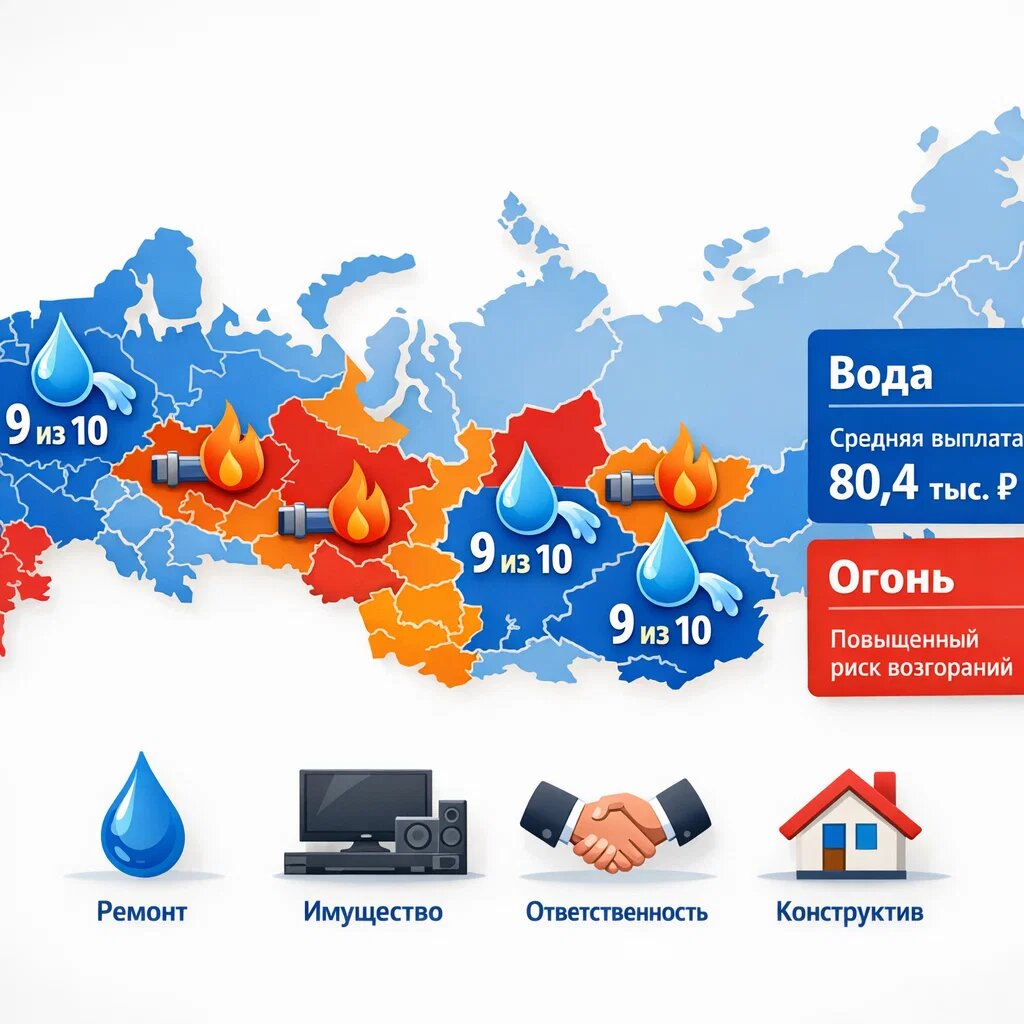 Новость, которая заставит вас проверить краны: Москва уже много лет — чемпион по заливам. Почти 9 из 10 страховых случаев с квартирами в столице — это последствия потопа. Такая же картина в Петербурге, Новосибирске и Челябинске. А вот в Татарстане, Нижегородской и Свердловской областях статистику портят пожары. А чаще всего с авариями труб и канализаций сталкиваются в Самарской области и снова в Татарстане. Цифра: В 2025 году средняя выплата после залива выросла в 1,5 раза и составила 80,4 тыс. рублей. Ущерб редко превышает 10-15% от стоимости ремонта и имущества, но даже эта сумма — неприятная потеря. Что делать? Застраховаться. Это не только для ипотечников. Страхование — ваш финансовый зонтик на случай ЧП. Что можно застраховать (выбирайте нужное): Ремонт/отделку — чтобы восстановить ламинат и обои после залива соседей. Имущество — технику и мебель от пожара, кражи или того же потопа. Гражданскую ответственность — если вы стали виновником залива у соседей снизу (самый недооцененный
