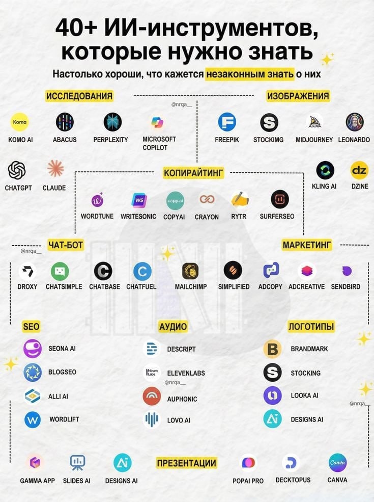 ⚡️ Мегашпаргалку из 4️⃣0️⃣ мощнейших ИИ-сервисов дропнули твиттерские — гении собрали наиболее полезные инструменты по райтингу, кодингу