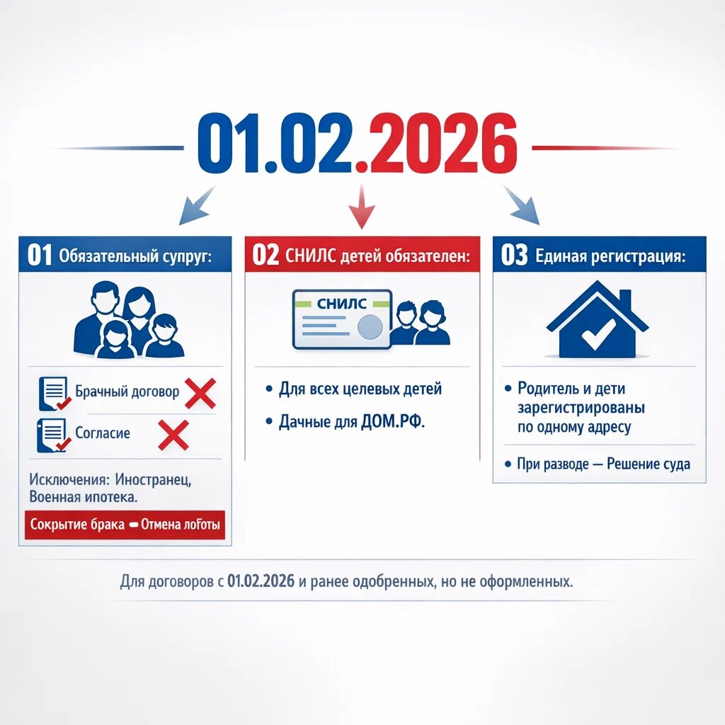 Новые правила действуют для кредитных договоров, заключённых с 01.02.2026, а также для одобренных ранее, но ещё не оформленных. 1️⃣ Обязательное участие супруга Если у целевого участника есть зарегистрированный брак — супруг(а) обязательно включается в кредитный договор. ❌ Исключение через брачный договор или нотариальное согласие больше не допускается. Исключения: супруг — иностранный гражданин; супруг — участник Военной ипотеки (при наличии подтверждающих документов). ⚠️ Сокрытие брака приведёт к исключению кредита из возмещения и повышению ставки. ДОМ РФ будет проверять данные через госреестры — информация о браке будет выявлена в любом случае. 📄 Штамп в паспорте не является доказательством — требуется официальный документ из ЗАГС / МФЦ. 2️⃣ СНИЛС детей — обязателен Необходимо предоставить и загрузить СНИЛС всех целевых детей. Данные обязательны для отчётности в дом рф. 3️⃣ Регистрация родителя и ребёнка Право на Семейную ипотеку имеет родитель, зарегистрированный по одному адресу