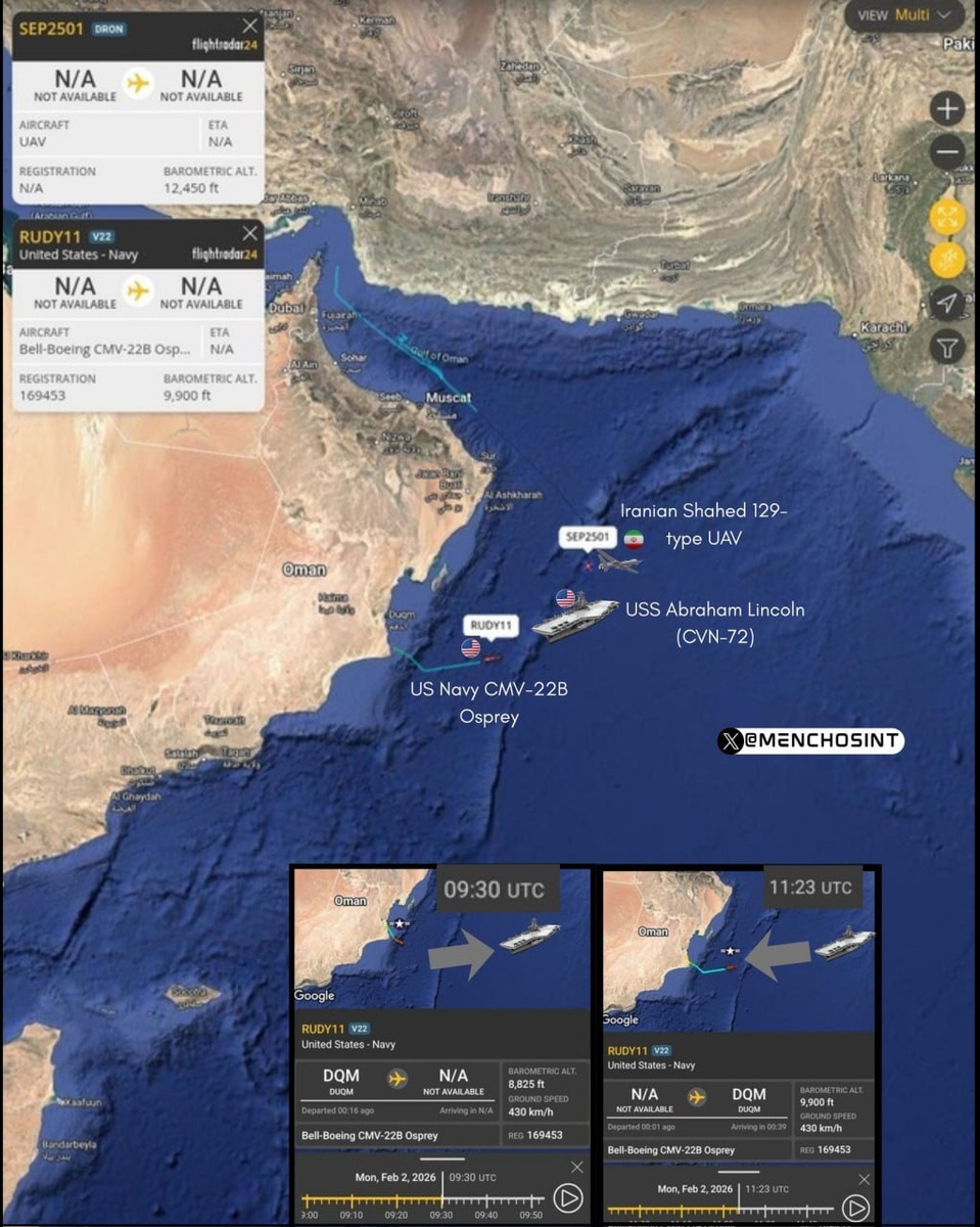 Иранский разведывательно-ударный БПЛА Shahed 129 преследует АУГ во главе с авианосцем USS Abraham Lincoln ВМС США в Аравийском море