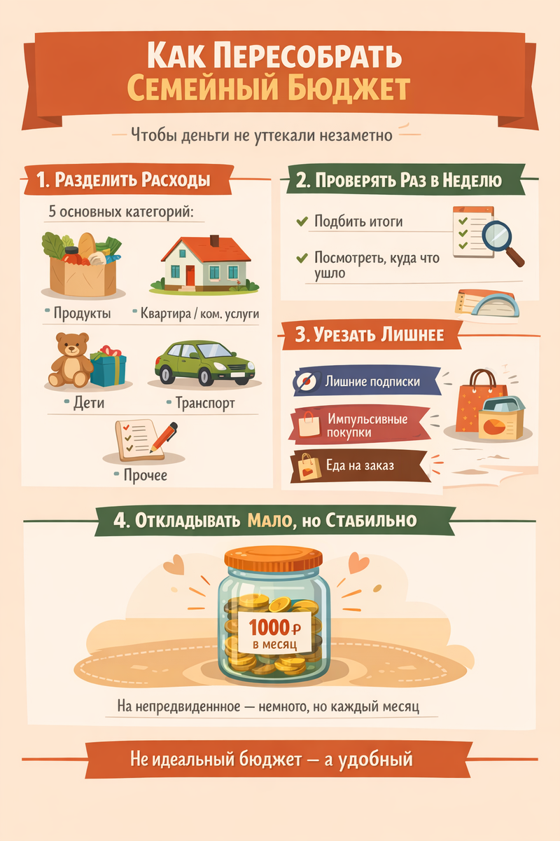 Разберём, как пересобрать семейный бюджет, чтобы перестать выживать и начать управлять деньгами. Раньше было так: зарплата → обязательные траты → «что осталось» В 2026 году эта схема ломается, потому что: Без пересборки семейного бюджета деньги растворяются незаметно. Первый шаг в планировании бюджета семьи —