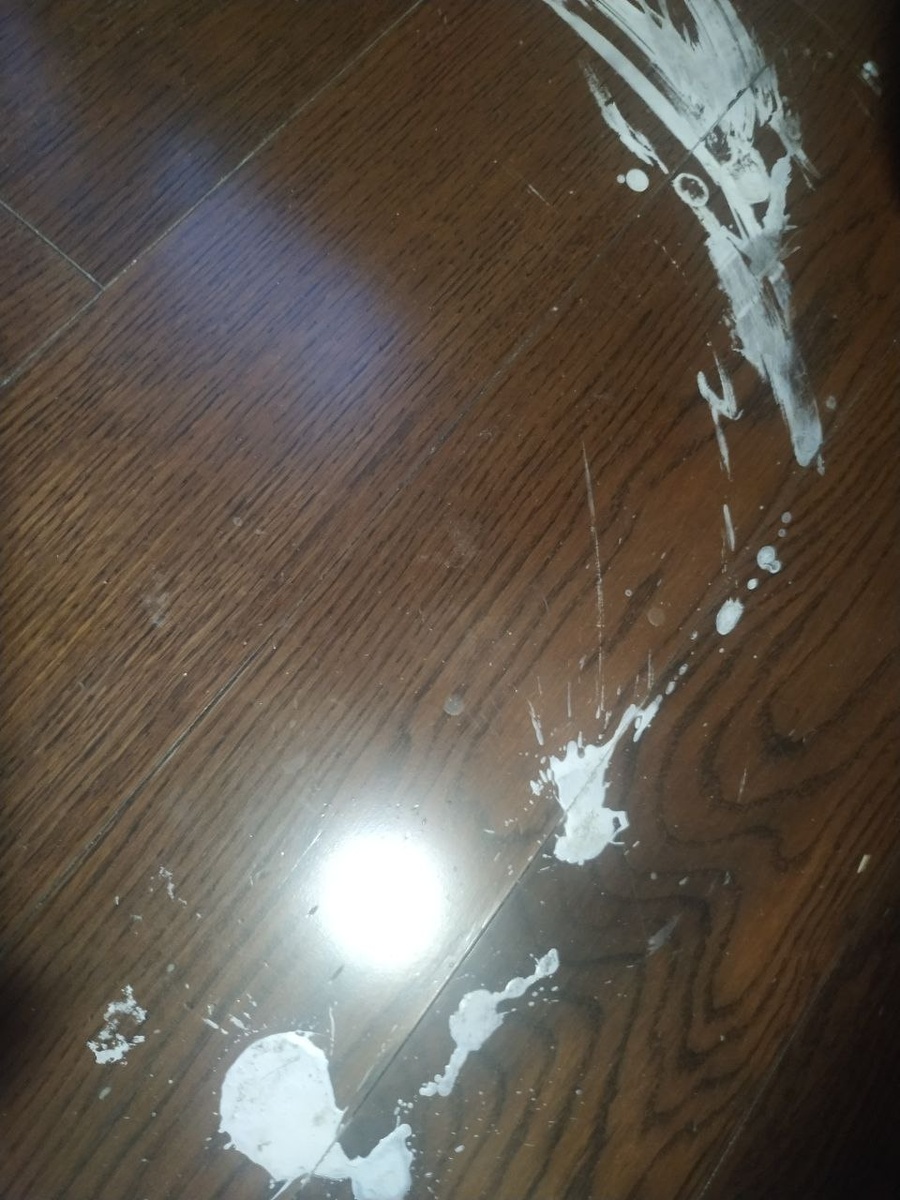 Здравствуйте, ребенок разлил канцелярский клей ПВА на паркет (см.фото). Может кто-то подскажет, как вывести засохший клей?