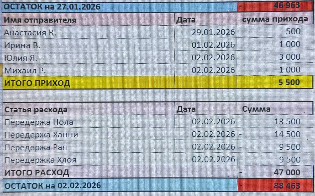Благодарим Вас 🙏 за помощь хвостикам 🐕🦺🐕🦺🐕🦺🐕 Оплачена передержки за февраль 2026 Собираем средства на погашение долга и за передержку 🙏 на март 2026 Ханни 14500 Нола 13500 Хлоя 9500 Рая 9500 ‼️ еженедельно можно поехать и познакомиться с хвостиками Карты привязаны к номерам телефонов: +7 985-977-03-22 Альбина (Сбер, Тинькофф) +7 916-069-34-82 Елена (Сбер) Подпись: «для собак» или «благотворительность»