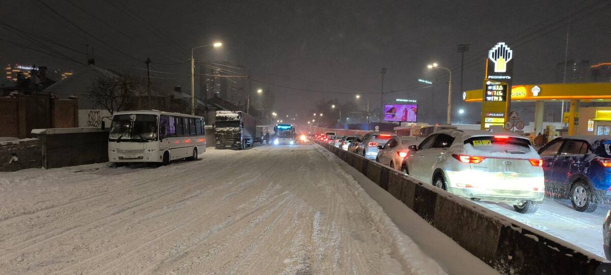 На Стадионной автобусы из-за нечищенной дороги не могут подняться в гору из-под путепровода — в результате всё движение заблокировано