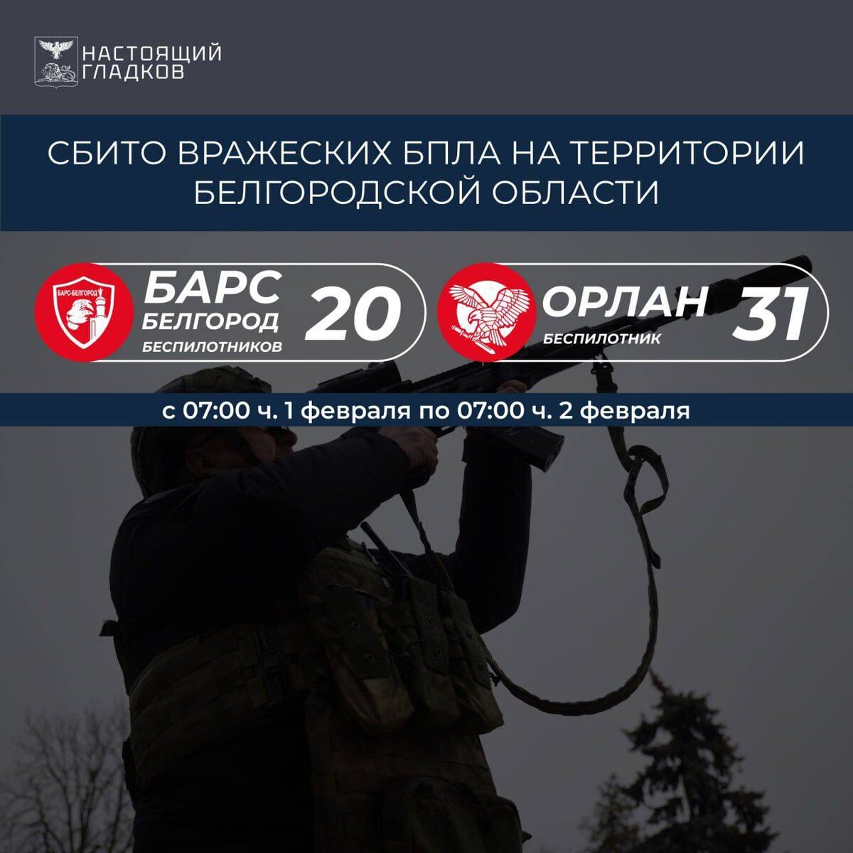 В период с 07:00 1 февраля до 07:00 2 февраля подразделениями «БАРС-Белгород» и «Орлан» было уничтожено 51 вражеский беспилотный летательный аппарат. ❕ Жесть Белгород - подписаться