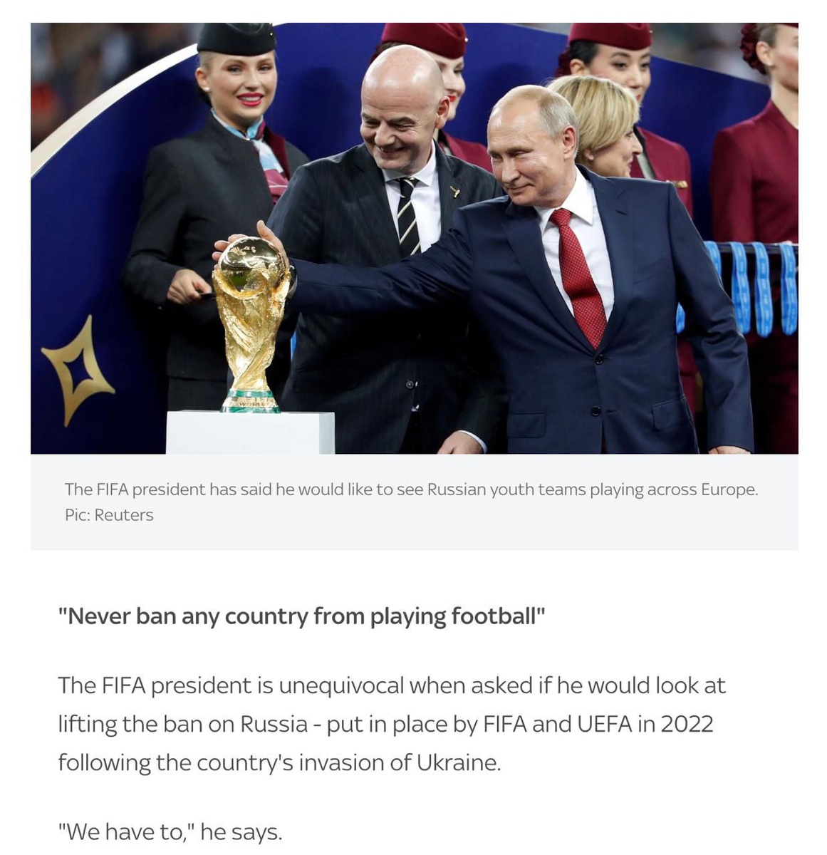 ФИФА может снять запрет на участие российских команд в международных турнирах: он действует с 2022 года, – заявил президент организации Инфантино.