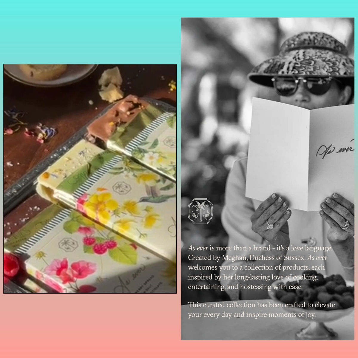 "As ever - это больше, чем просто бренд, это язык любви. Созданный Меган, герцогиней Сассекской, бренд As ever предлагает вам коллекцию товаров, каждый из которых вдохновлен ее давней любовью к кулинарии, организации вечеринок и непринужденному приему гостей. Эта тщательно подобранная коллекция создана для того, чтобы сделать вашу повседневную жизнь лучше и подарить моменты радости".