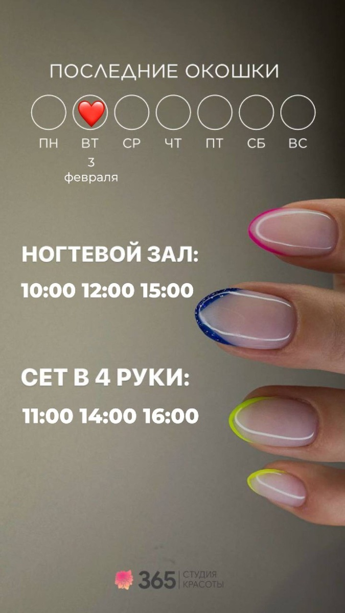 🤍🤍🤍 Ловите аффирмацию на эту неделю: "Каждый день я становлюсь ещё прекраснее, ощущаю свою привлекательность и излучаю внутреннюю гармонию. Моя красота заметна каждому взгляды и я гордо принимаю комплименты окружающих" 🤍🤍🤍 #красота #наслаждение #забота #зима #любовь #мечты сбываются #радость #возможности ЧТО МОЖНО УСПЕТЬ СДЕЛАТЬ 03 февраля 2026 года : Ногтевой зал: 10:00 12:00 15:00 Сет в 4 руки: 11:00 14:00 16:00 Парикмахерский зал: ближайшая запись на 5 февраля Оформление бровей и ресниц: ближайшая запись на 5 февраля Косметология/шугаринг: ближайшая запись на 04 февраля ЗАПИСАТЬСЯ МОЖНО ЛЮБЫМ УДОБНЫМ СПОСОБОМ: 👉🏻 Сообщение в Whats'app https://wa.me/79663654477 👉🏻По телефону +79663654477 👉🏻Онлайн запись https://n286444.yclients.com/ #команда365 #красота #наслаждение #забота #зима #январь #любовь #мечтысбываются #радость #возможности