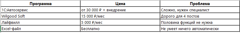 Я сделал таблицу, которая закрывает 80% потребностей небольшого автосервиса. Без установки, без абонентской платы, без обучения персонала.