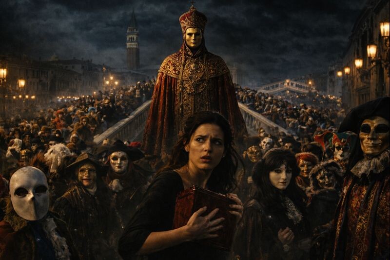 Софья повернулась и попала в плотный круг маскарадной толпы. Её понесли, как щепку. И тут она увидела Его. В нескольких метрах, возвышаясь над толпой, стояла фигура в величественных одеждах Дожа Венеции — алые робы, горностаевая мантия, корно-дукале, рогатая шапка власти. И золотая маска, неподвижная, без эмоций, с прорезями для глаз, черными как смола. Фигура не двигалась, просто стояла, и толпа, смеясь, обтекала её. Но Софья почувствовала, как её охватывает парализующий холод. Это был не просто костюм. Это была инертная, тяжелая масса, враждебная самой жизни. Взгляд из-под маски был устремлён прямо на неё.