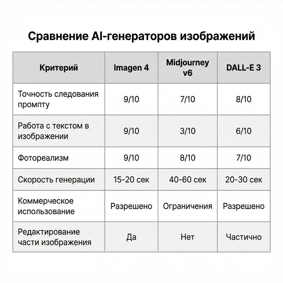 Протестировала Imagen 4 против Midjourney v6 и DALL-E 3 на 50 рекламных креативах. Критерии простые - те, что важны в реальной работе:
