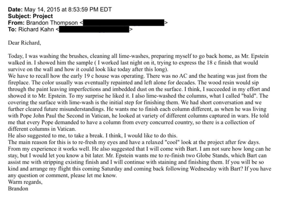 Об этом свидетельствует электронная переписка 2015 года, касающаяся одного из его проектов по реставрации. В письме от 14 мая 2015 года Брэндон Томпсон сообщает Ричарду Кану, что Эпштейн, обсуждая дизайн колонн, сослался на свой опыт пребывания в папской резиденции: «Он рассказал, что когда жил в Ватикане вместе с папой Иоанном Павлом II, то видел множество различных колонн...». Подпишись на "Новый Взгляд"