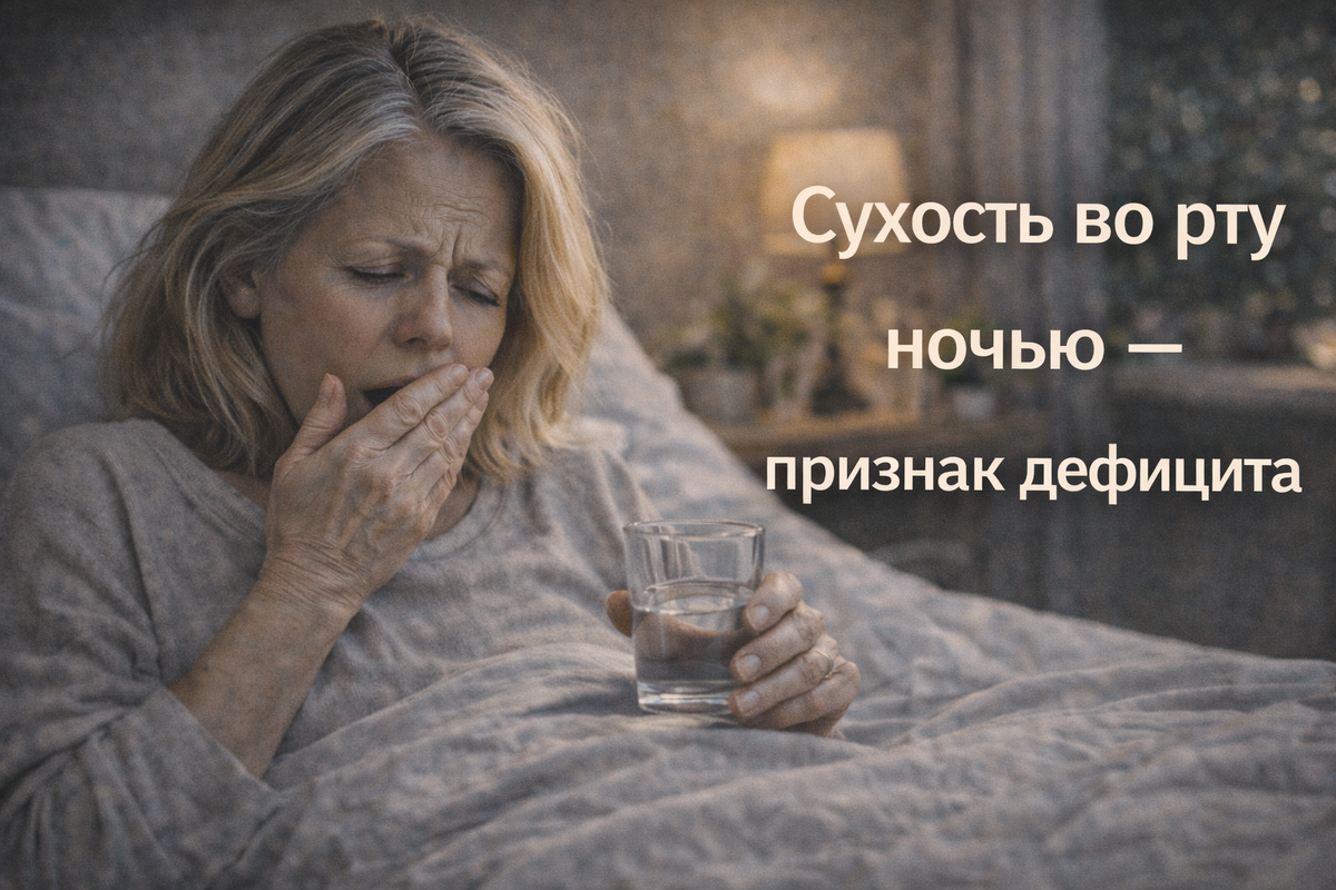 Пробудиться среди ночи от ощущения, что язык прилип к нёбу, — знакомо многим после 50. Кто-то считает это возрастом, кто-то обвиняет отопление или храп. Но сухость во рту ночью — не просто мелочь. Это физиологический сигнал, который нельзя игнорировать. Особенно если он повторяется часто. Разберёмся, почему именно ночью появляется это ощущение, и о каких дефицитах оно может говорить. Слюна — не просто жидкость, а важная часть иммунной защиты полости рта и пищеварения. Её объём резко снижается ночью — это норма. Но в норме рот не должен пересыхать «до трещин». Если пересыхает — есть причина. Основные физиологические триггеры: Но чаще всего, по данным исследований, сухость ночью — не симптом старости, а признак дефицита микронутриентов, важных для работы нервной и слюнной систем. Недостаток магния нарушает регуляцию нервной системы, включая работу вегетативной иннервации слюнных желёз. ➡️ Симптомы, помимо сухости: Они участвуют в синтезе нейромедиаторов и восстановлении слизистых. При их