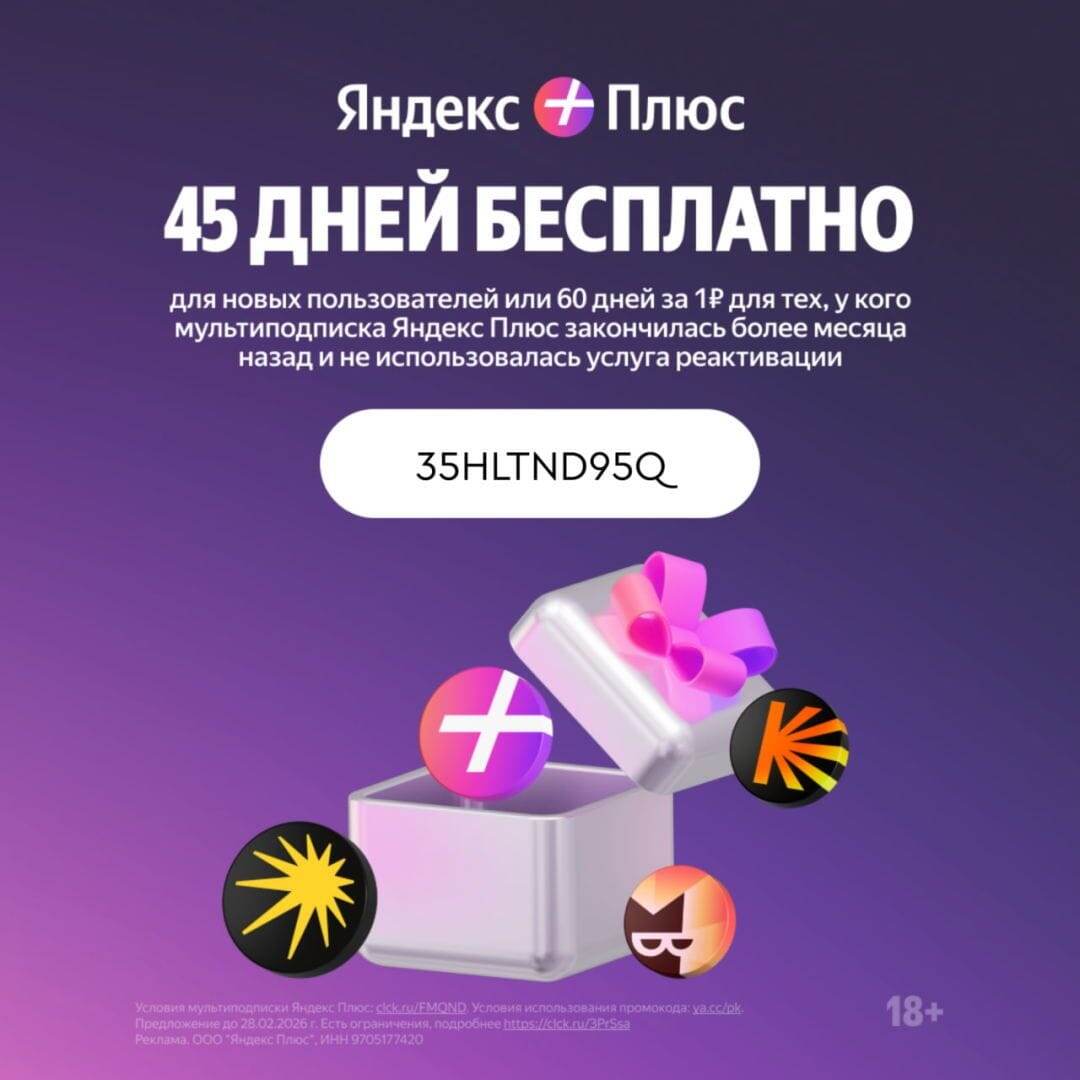 Хочу рассказать, как получить бесплатные 45 дней Яндекс Плюс и пользоваться всеми бонусами сервиса. С помощью промокода новые пользователи могут получить 45 бесплатной подписки на сервис Яндекс Плюс, а старые пользователи всего за 1 рубль 60 дней подписки. 35HLTND95Q - 45 дней доступа к Яндекс Плюс бесплатно для новых пользователей или 60 дней за 1₽ для пользователей без активной мультиподписки ПРИМЕНИТЬ ПРОМОКОД Для того, чтобы воспользоваться бесплатным доступом к Яндекс Плюс, достаточно здесь несколько простых шагов. Яндекс Плюс объединяет доступ к нескольким сервисам Яндекса, включая музыку, кино и бонусы для покупок. Дополнительные бонусы Если по истечению срока бесплатного периода вы захотите отменить подписку, то вам необходимо сделать следующее: Нет. С промокодом 35HLTND95Q вы получаете бесплатный доступ ко всем функциям Яндекс Плюса. Это сделано для того, чтобы вы смогли протестировать сервис и принять решение продлевать дальше или отказаться. По окончанию 45 дней вы можете