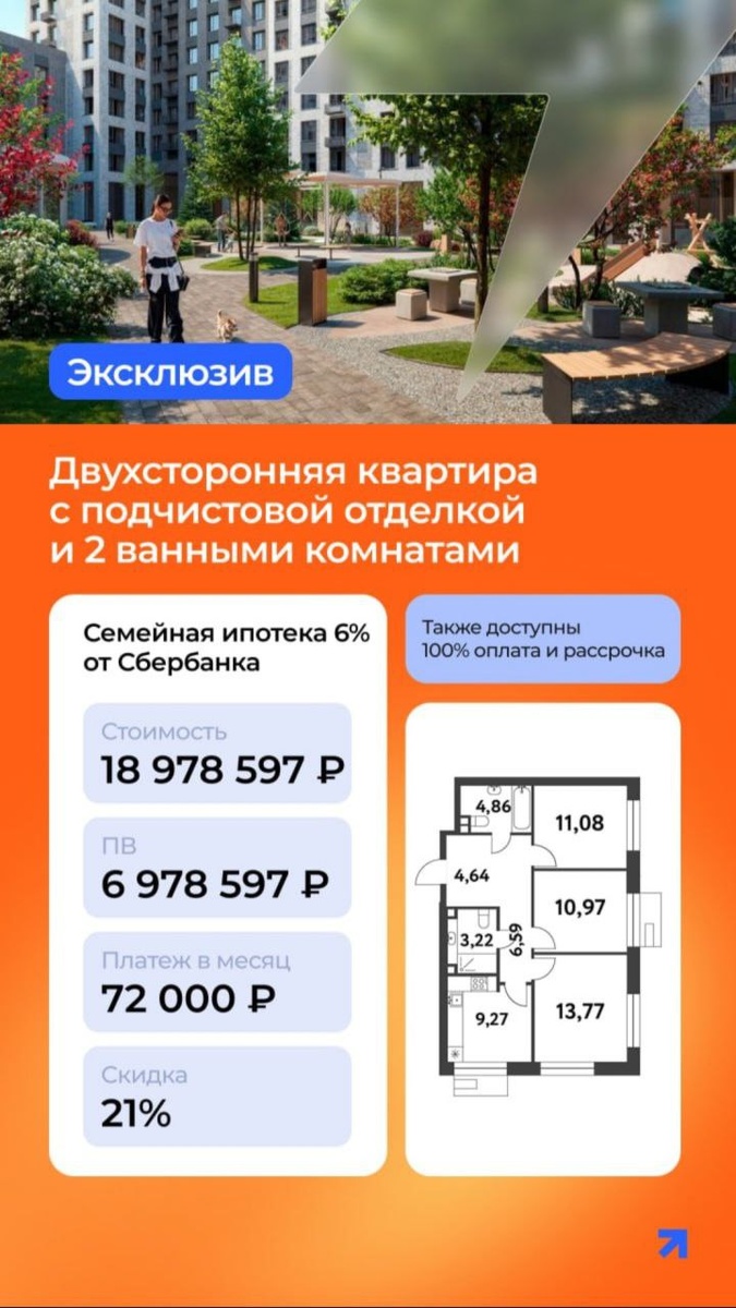 💭 3ккв. 64.4 м² на 2 этаже Базовая стоимость без отделки: 23 392 195 ₽ При 100% оплате: 18 978 597 ₽ Квартиру можно купить по Семейной ипотеке от Сбербанка и рассрочке с ПВ 20%, 51% или 70%. Примеры расчетов в карточках. 🔰 В расчете применена максимальная скидка, в том числе эксклюзивная скидка для наших клиентов!