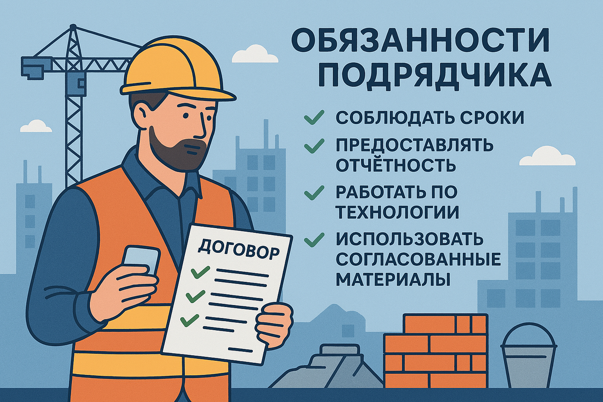 Исполнитель обязан соблюдать сроки, предоставлять отчётность, работать по технологии и использовать согласованные материалы.
